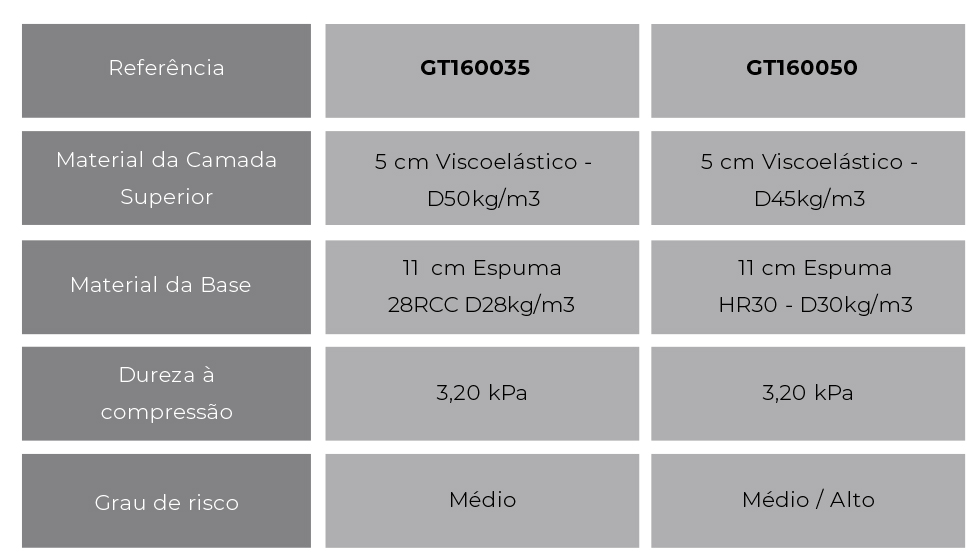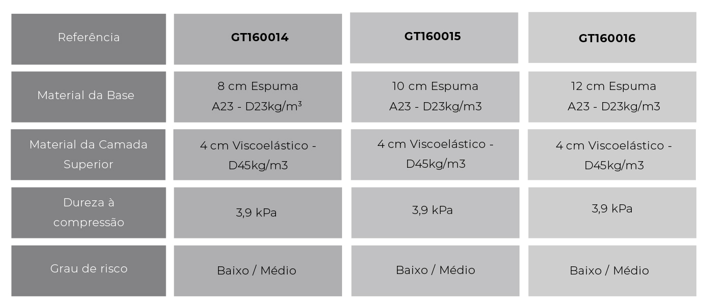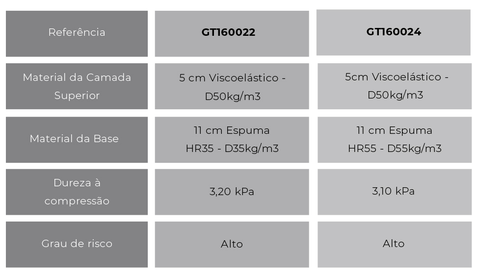 Os colchões GT160022 e o GT160024 são compostos por uma base em espuma com uma estrutura celular aberta e homogénea o que permite a passagem do ar.